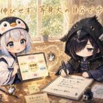 黒羽がノートパソコン(または複数のPC資料)を前にして、何かを書き込んでいる。隣に「初心者向けガイド」みたいな小さなメモが置いてある。表情は眠たそうだけど、ちゃんと集中している感じ。