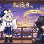 夕暮れの窓際で、海空と黒羽が並んでいる。海空は空に向かって両手を広げていて、黒羽は目を細めて画面を見ている。背景には長文が広がるようなエフェクトと、システムのコードが光るイメージ。タイトル文字「転換点。」が金色に輝いている。